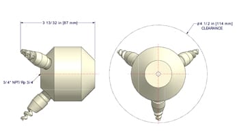 BETE应用工程专门指定了一个gydF4y2Ba登月舱8gydF4y2Ba有三个gydF4y2BaTF8FCgydF4y2Ba在定制歧管顶部的喷嘴。在歧管底部不会有喷嘴。为了让管线在运行后能够排出,管汇设计了一个3/16”(4.8毫米)的流孔。喷嘴将在40 psi (2.8 bar)的压力下工作,周期5分钟,在罐的顶部提供一个硬擦洗喷雾。gydF4y2Ba