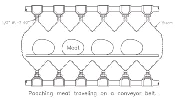 一位BETE的顾客有一个大的螺旋烤箱,里面的肉是水煮的。目标是在60psi (4.1 bar)下注入1800磅/小时(816.5 kg/小时)的蒸汽。蒸汽将从肉的上方和下方的喷嘴喷射出来。肉将在一个金属网传送带上通过烤箱。GydF4y2Ba