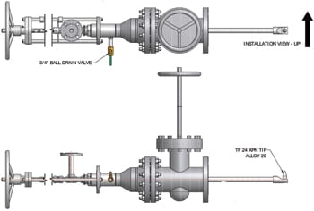 一家工程公司联系了寻找酸性水注入系统的葡萄干,以擦洗含有氯化物和氰化物的Coker Fractionator的架空线。当系统在服务中时,喷嘴需要可伸缩。30“管道内的条件为250°F(121°C)和20 psig(1.4 barg)。gydF4y2Ba