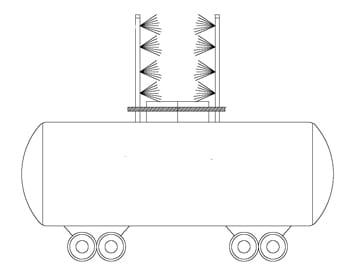 一位BETE的客户需要一个空气喷嘴系统来吹除硫磺轨道车厢开口的烟雾。运营商将在已经部分满车的轨道车厢上再加一节。当操作者站在一个可伸缩平台上时,2'(610毫米)的开口将位于操作者的脚边。喷嘴将安装在一根垂直管道上,从平台延伸出7英尺(2134毫米)高。喷嘴将在操作者的两侧,但根据风向,一次只能有一个头部运行——通常是10英里/小时(16公里/小时)。硫是炼油厂的副产品。GydF4y2Ba
