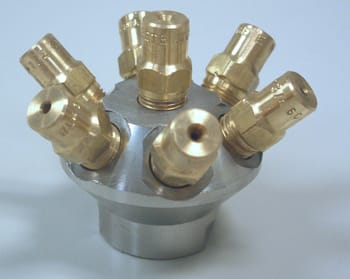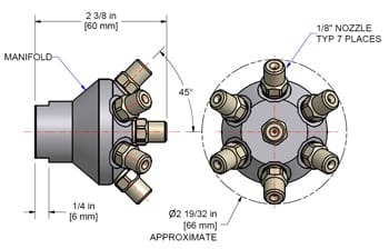 客户的主要标准是覆盖宽度,所以BETE应用工程师测试了几个喷嘴,提供了广泛的覆盖模式。客户在70 psi (4.8 bar)压力下的产能约为100 SCFM (2.63 Nm³/min),因此使用BETE的Gas Flow软件对孔板进行了尺寸调整,以确保它们能够相应地流动。BETE还考虑了覆盖7英尺高所需的喷嘴数量。使用单喷嘴时,喷雾的形状都太窄,呈椭圆形。同样测试的是一个特殊的喷嘴歧管,很像MW头。广泛报道的结果是有希望的,但流量有点低。使用BETE软件和喷雾实验室,BETE能够确定使用四个GydF4y2Ba西城1/2-60sGydF4y2Ba和三个GydF4y2Ba西城3/4-60sGydF4y2Ba在70 psi的压力下,特殊管汇的流量为26 SCFM (0.685 Nm³/min),从2英尺外覆盖32英寸(813 mm)的直径。最终的设计有一个WL 1/2-60在中心,其余的WL喷嘴交替和环绕中心WL。圆形的喷雾图案GydF4y2Ba西城喷嘴GydF4y2Ba提供空气导致覆盖是坚实的,符合客户的标准。GydF4y2Ba