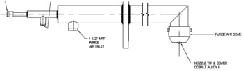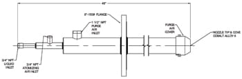 该客户是一家电厂OEM,有一个燃煤电厂可控硅系统的初步规范。他们想要向电厂烟气中喷洒0.57至0.62 gpm (2.16 L/min)的29%氨水溶液,以控制NOx的排放。可用的空气压力高达80psi (5.5 bar)。为了确保完全蒸发,液滴的尺寸要尽可能小。施工要求的材料是316不锈钢。喷枪有一个8" 150#安装法兰。因为这是一个初步规范,OEM要求两个选项,直线配置和直角配置。gydF4y2Ba