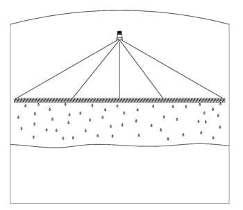 任何喷雾喷嘴的喷雾角大于0时,都赋予其产生的液滴一个径向速度。这一点,连同液滴的质量,决定了它的动量。当液滴击中一个目标时,这个动量被转移到目标上。如果目标是另一种液体,这个动量会使目标液体产生一些运动。避免这种情况的传统方法是将许多小喷嘴放置在目标上方足够高的位置,以便通过空气阻力消散径向速度。由于此应用程序处于一个槽中,因此该选项对客户来说并不实际。BETE应用工程师建议在油表面上方安装一个屏幕,并使用一个中央安装的宽喷角喷嘴gydF4y2BaMaxiPass 125 wgydF4y2Ba在这种情况下,把乙醇分散到屏幕上。屏幕会吸收液滴的径向动量,然后乙醇会慢慢滴到油上。gydF4y2Ba