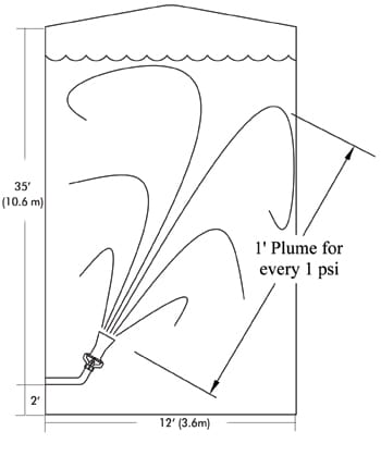 BETE应用工程师知道这个工作的工具是gydF4y2BaTurboMix®系列喷管混合喷嘴gydF4y2Ba.客户的连接尺寸选择限制在3”喷嘴gydF4y2BaTM1500gydF4y2Ba在40 psi (2.75 bar)的压力下,动力流体的流量为300 gpm (1135 L/min)。由于其文丘里设计,TurboMix将增加3到5倍的动力流量,因此每小时混合大约是整个油箱体积的2.5倍。一般的经验法则是1'(0.3米)羽流每1 psi (0.07 bar),所以通过安装每个喷嘴在一个60度垂直向上的弯管,彻底的混合整个坦克高度应该很容易实现。gydF4y2Ba