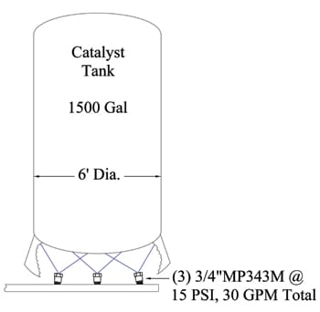 化学加工公司联系了Bete Applications Engineering,以了解坦克冷却系统的紧急情况。它们具有加压液体混合容器,具有1500加仑(5,700升)容量和连续运行的内搅拌器。在电力停电期间,罐内的催化剂沉入底部并导致温度迅速增加。他们采取了使用他们的防火系统进行冷却,但现在他们现在想要为这样的情况安装单独的系统。因为坦克的其余部分被绝缘材料包围,所以他们想要喷洒在支撑裙下的罐子的底部。客户拥有15个PSI(1巴),并知道他们想要喷洒大约30升(120升/分钟)。GydF4y2Ba