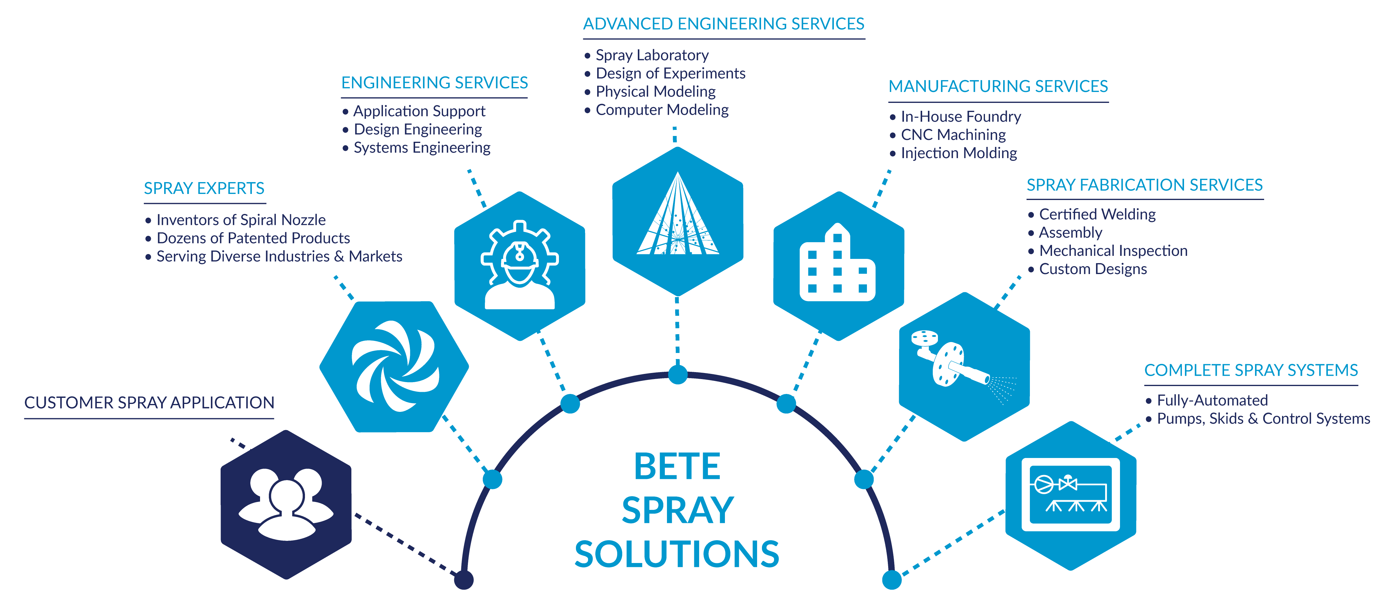 在BETE,我们业务的成功根植于理解客户的业务,为他们的流体工艺挑战提供有效的工程解决方案。BETE拥有超过70年的设计和制造喷嘴和喷涂系统的经验,是值得信赖的喷涂技术提供商。gydF4y2Ba我们倾听并与客户合作,确保为他们的喷涂挑战提供最佳解决方案。gydF4y2Ba
